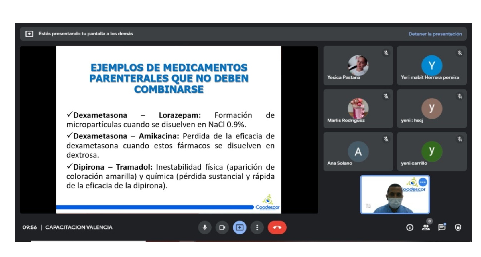 El 14 de octubre, el personal de enfermería de la ESE Hospital Sagrado Corazón de Jesús de Valencia, recibió una capacitación virtual por parte de Coodescor, acerca de conservación adecuada de medicamentos y de incompatibilidad de medicamentos parenterales.