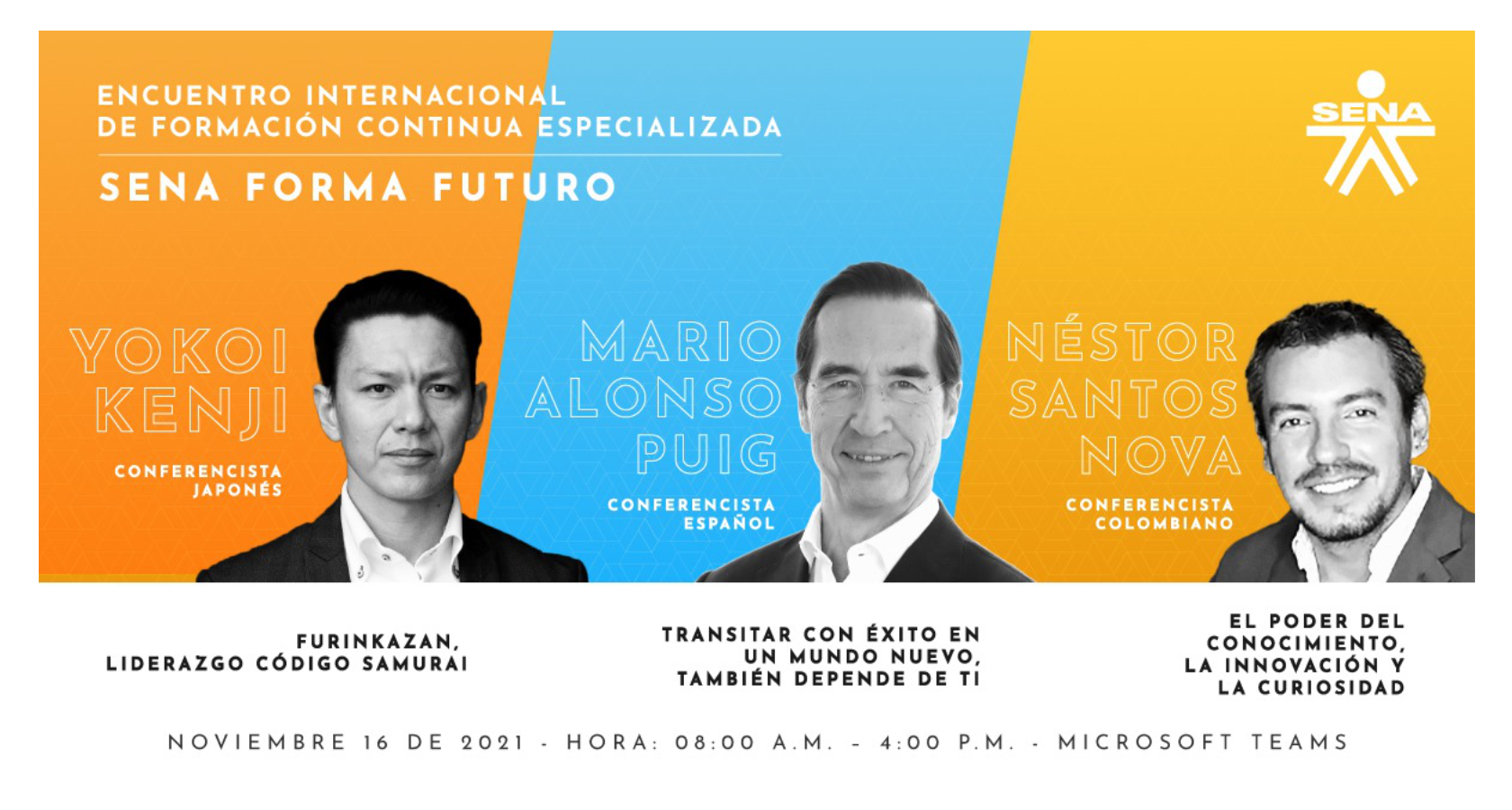 A través de sus convenios de formación especializada con diferentes entidades, entre ellas ACESI, el SENA realizará una jornada virtual con tres conferencistas de talla internacional, quienes hablarán de distintos temas alrededor del liderazgo, el éxito y la innovación, el próximo 16 de noviembre, a las 8:00 a.m.