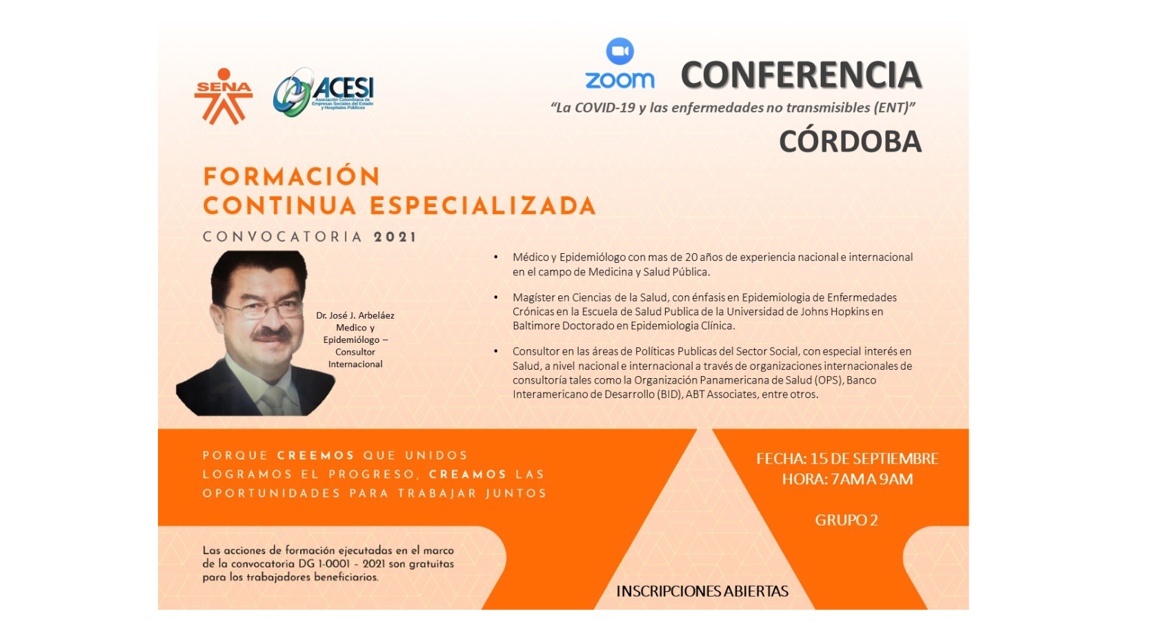 En el marco de las actividades del convenio de formación continua especializada ACESI SENA 2021, se llevará a cabo para Córdoba la conferencia virtual “La COVID – 19 y las enfermedades no transmisibles (ENT)”.